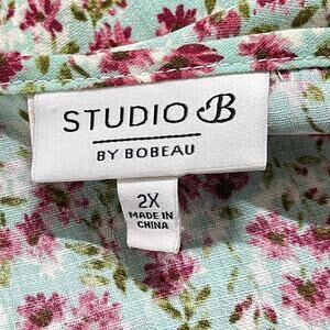 Bobeau Top Plus 2X Green Pink Floral Twist Front Cottage Fairy Short Sleeves