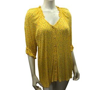 Bobeau Yellow Polka Dot Boho-Chic Button-Up Blouse Ruffle Sleeves Womens L NWT
