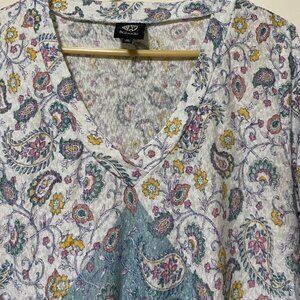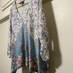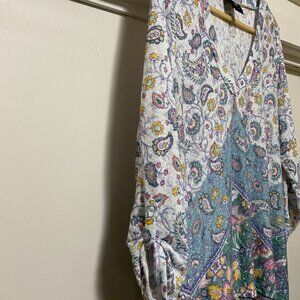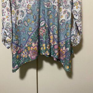 Bobeau long sleeve, beige & teal asymmetrical tunic, size XL