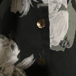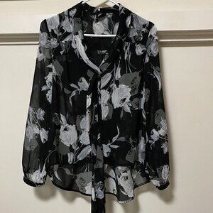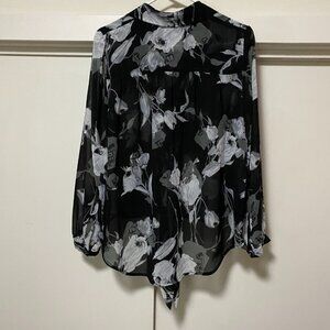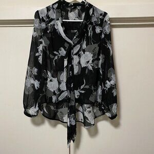 Bobeau long sleeve, black button-down blouse w/flowers & front tie, size M