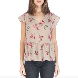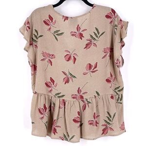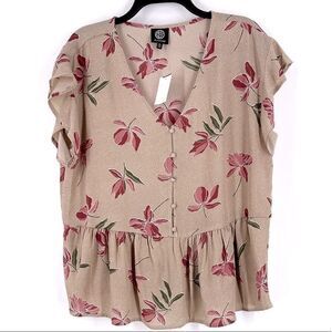 Bobeau Floral V-neck Button Front Peplum Top Size L