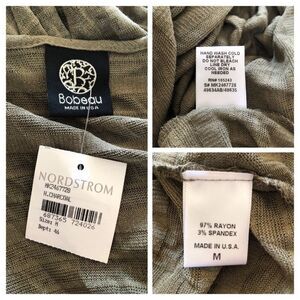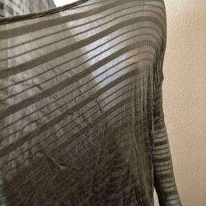 A sheer knit textured with delicate stripes is shaped into a slouchy layering piece with softly draped panels crisscrossing the front and a high/low hem. This style fits true to size (M=8). Please note a repair was done in front, not noticeable when worn.