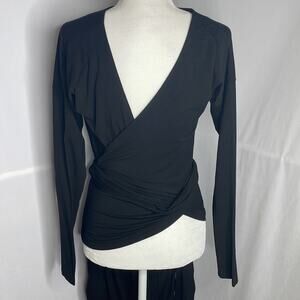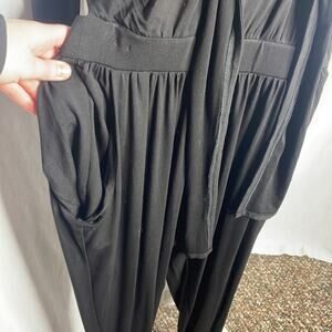 Bobi black Los Angeles black jogger jumpsuit. Unique wrap top that can be tied in the back or wrapped around front. Many ways to tie it.