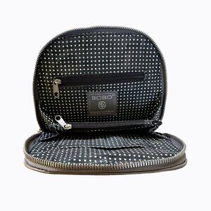 This BOBO crossbody bag in a versatile warm taupe-gray color brings contemporary style with a practical, polished design. Ideal for the office or a casual day out, it features a secure zip closure, silver hardware, and an adjustable crossbody strap for hands-free convenience. Inside, the contrast black-and-white polka dot lining adds a playful touch, while two zip pockets and a slip pocket keep essentials organized.