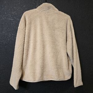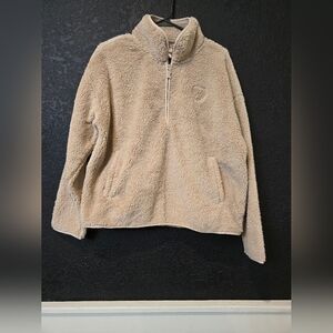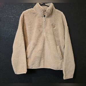Stay cozy and stylish with this adorable Bobs From Skechers Cuddle Dog Paw Print Fleece Pull Over Jacket in size Medium. The jacket features a solid beige color with a cute dog theme and accents of the brand's logo. It has a collared neckline, long sleeves, and a 1/4 zip closure with pockets. The outer shell is made of polyester fleece material, making it perfect for the fall and winter seasons.