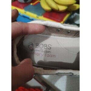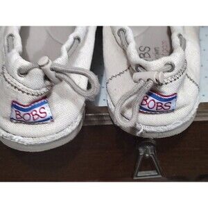 These BOBS Skechers canvas slip-ons are in pre-owned, fair condition. They show signs of prior wear consistent with their condition, offering an economical option for comfortable footwear. They are a practical choice for those seeking a relaxed and supportive shoe.