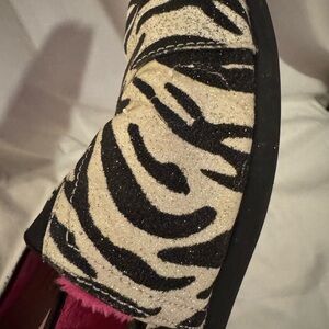 Step out in style with these Bobsslip-on shoes featuring a bold zebra print. Perfect for casual outings, these shoes offer comfort and a trendy look. The black and white design makes them versatile for any wardrobe. There are flecks off sparklers all over