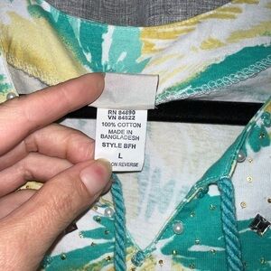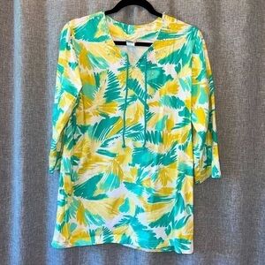 Brighten up your wardrobe with this vibrant Boca Bay long sleeve top featuring a bold yellow, teal, and white feather-inspired print. Perfect for casual outings or adding a pop of color to your everyday look.