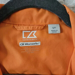 This is the brand cutter & buck weather tec Windbreaker. It's from the Boca Raton Resort with the embroidered logo on the left sleeve. It's in excellent used condition, a women's size small. It's not as bright orange in person as it shows in the photos, in my opinion.
