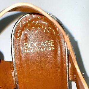 Bocage Innovation leather gold metallic low wedge round buckle sandals size EU39. Rather soft straps on the uppers. Quite comfortable. Casual elegance. Can be dressy, yet never dangerous. Super pretty gold tone. Nicely made.
