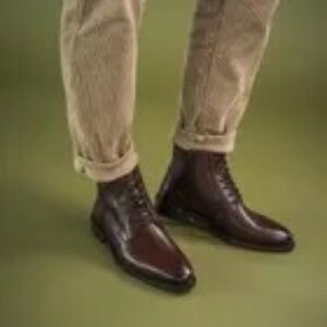A lace-up ankle boot with a tapered shape and almond toe, turned-stitch inserts at the heel and on the quarters.