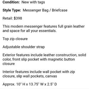 NWT Boconi Garth Urban messenger bag in Conyac. This bag is gorgeous, so well made. Outstanding quality full grain leather. Use as a media bag, Crossbody, unisex and versatile.