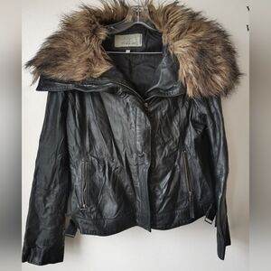 Bod Christensen BLACK Leather Moto Jacket with Faux Fur Wide Collar L