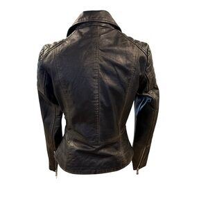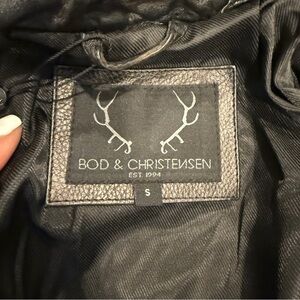 The Bod & Christensen Blake Brown Leather Moto Biker Jacket for women in size small features a classic biker style with asymmetrical zip closure and collared neckline.