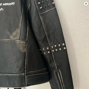 The jacket has studs and spikes along the shoulders and sleeves. The back has a skull printed on it with the words “miracle workers.”