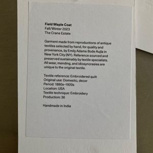 Field Maple Coat Fall/Winter 2023 The Crane Estate Garment made from reproductions of antique textiles selected by hand, for quality and provenance, by Emily Adams Bode Auila in New York City (NY). Reference sourced and preserved sustainably by textile specialists. All wear, mending, and idiosyncrasies are unique to the original textile. Textile reference: Embroidered quilt Original use: Domestic, decor Period: 1880s-1920s Location: USA Textile technique: Embroidery Production: 36 Handmade in India