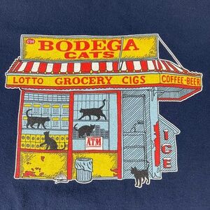 Fun and quirky New York City “Bodega Cats” graphic T-shirt in a rich navy blue color.