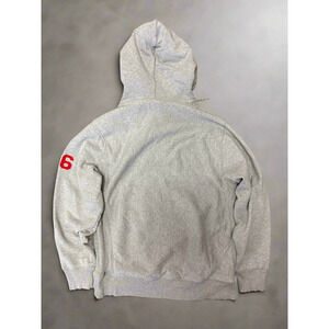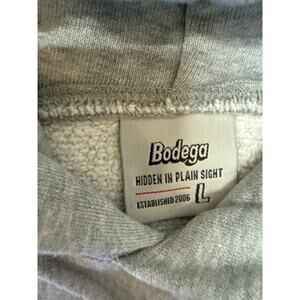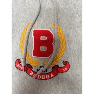 Classic Bodega “Hidden in Plain Sight” Collegiate Hoodie in heather grey, featuring a felt varsity “B” patch with embroidered laurel crest and bold “06” detail on the sleeve. Made from 100% cotton with soft fleece interior.