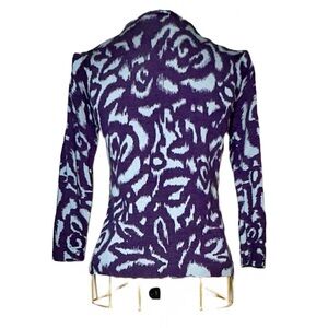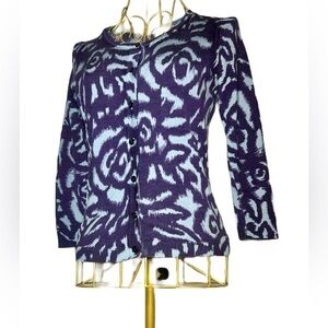 Boden 100% Wool Button-Up Cardigan in Purple & Blue Swirl Pattern with Purple Buttons and Lilac Suede Placket, Size 6.
