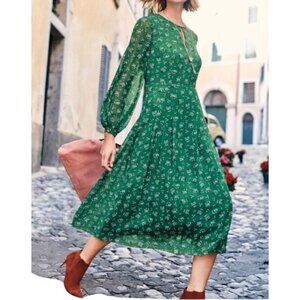 Boden Ada Midi Dress Green Floral With Puff Sleeves keyhole Neckline UK 6P US 2P
