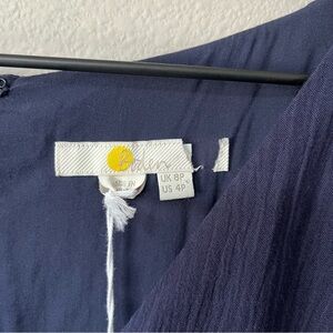 Brand new with tags Boden Alice Wrap Jumpsuit in navy blue. Size US 4 petite. Faux wrap front. Short kimono-style sleeves. V-neck. Pants with pockets. Snap at chest. Zip and hook closures at back. Crinkle fabric. NWT- the adjustable tie belt is missing and not included; interior brand label has been cut.