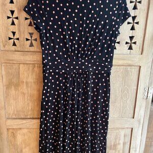 Boden dress, polka dot dress, black and pink dress, jersey dress, midi dress, workwear dress, casual chic, classic dress, women’s size 8