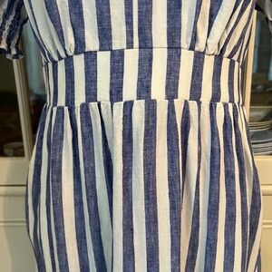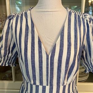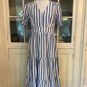 Boden Anna Linen Tiered Midi Dress, US 10, Blue & White Striped