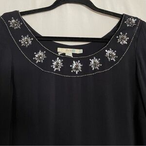 -Navy in color with silver sequin beaded details around collar and wrists