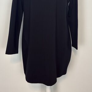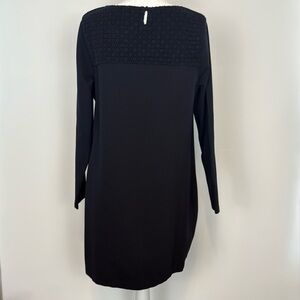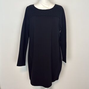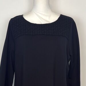 Boden Black Cotton Blend Shift/Tunic Dress with Crochet detail at Neck. Size 14 R. In good preowned condition. No stains or holes. Pull over style with one button at back of neck. Crochet design top of dress. Long sleeve. Knee Length. Lagenlook, Minimalist. Armpit to pit measures 20 inches. Total length 35 inches. Comes from a smoke free home.