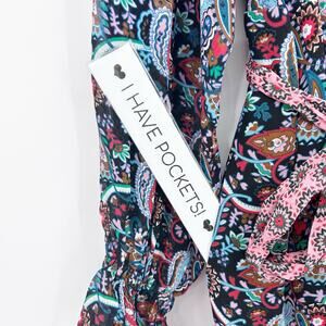 Boden Black Frill Tiered womens dress in black and paisley. Maxi length georgette dress with ruffles along hem, cuffs, and shoulders. Mock neck button collar. Contrasting tie waist. Side seam pockets. Size 6. Excellent used condition. No flaws detected. See measurements for proper fit.