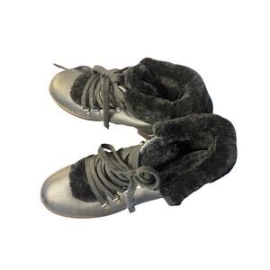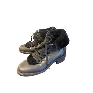Boden Black Leather Sherling Cuff Lace Up Combat Moto Boot, Grunge, EU 41, US 10