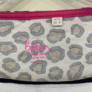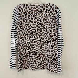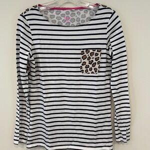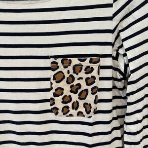 Stylish long sleeve tee with black and white stripes. Features a leopard print back and pocket. Perfect for casual wear.