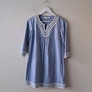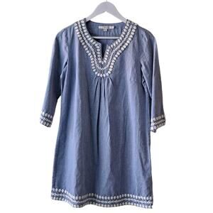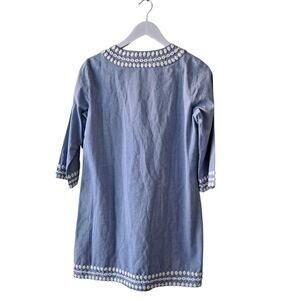 Boden Blue Chambray 3/4 Sleeve Slit Neckline Dress with Neckline, Sleeve & Hem Embroidery - Size US 6P (UK 10P)
