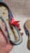 blue denim-like fabric with pink sequin floral and side bow.