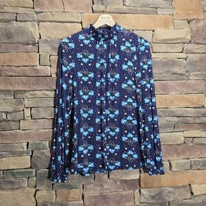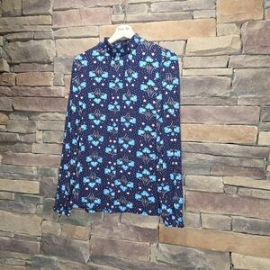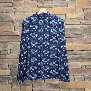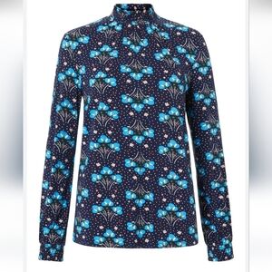 Elegant blue blouse with floral pattern. Long sleeves and high neckline. Perfect for any occasion.