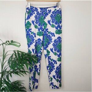 Blue, green, and cream floral cropped ankle skimmer pants. Slim, straight leg.