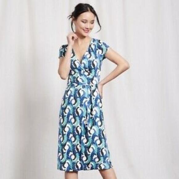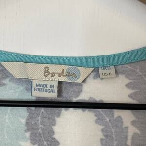 Boden Blue White Feather Printed Long Sleeve Ruched Waist Dress Women's Size 6