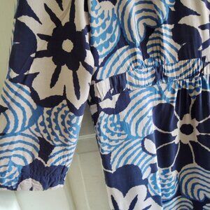 Boden blue & white floral mini dress, size 6 (US) or 10 (UK). Summery mini dress (or wear as tunic) has a scoop neck, 3/4 sleeves, and ruched waistband. Off white (shading to gray) background with navy & lighter blue swirly floral print. Light and airy, with a bit of a retro 70s vibe. EUC.