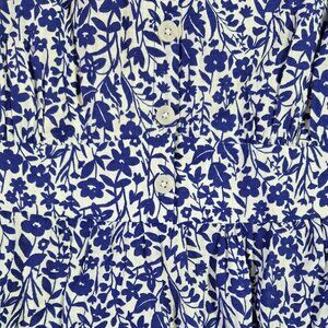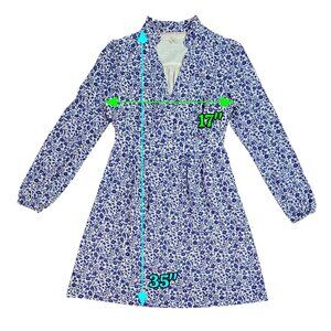 Good used condition, with no stains or tears. A blue and white floral mini dress, with long sleeves. Has an eye-catching notch neck and buttons at the upper front. Elastic cuffs. Comfortable and breathable as it is pure cotton.