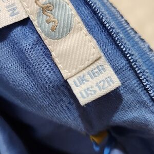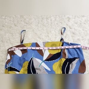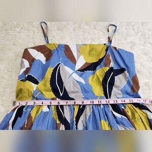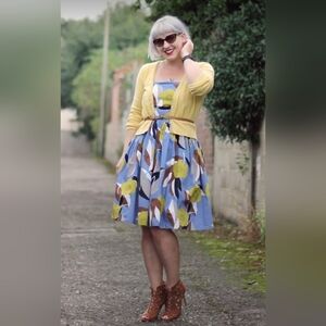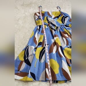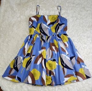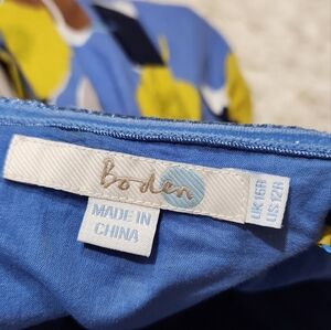 Vibrant floral dress by Boden. Features a blue base with yellow and brown leaf patterns. Perfect for a casual outing.
