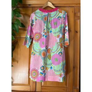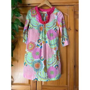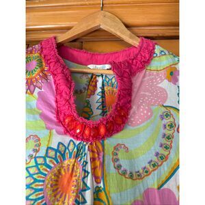 Boden Boho Tunic Dress UK 8 / US 4 – Bright Floral Print, Pink Embellished Neckline, 100% Cotton