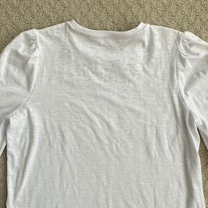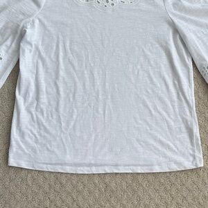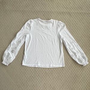 Boden Broderie Insert Long Sleeve Jersey Top - White - Size 6 - Embroidered/Preppy/Cut-Out. Upgrade your wardrobe with this puff-shouldered top from Boden featuring a round neckline, long sleeves with elastic cuffs and ruffle detail, embroidered detail a the neckline and sleeves, straight hem, and easy pullover styling. Excellent pre-owned condition!