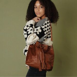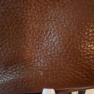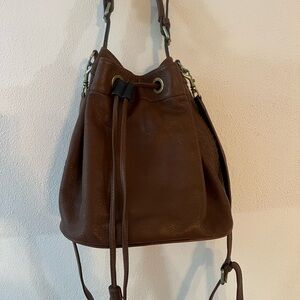 Stylish and versatile brown leather bucket bag, perfect for any occasion. Features a drawstring closure and adjustable strap for comfort. Has a handle and crossbody strap. This is real leather. Interior needs a cleaning. Has a several scuffs on the exterior feathered in the photos.