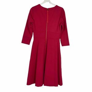 Boden Bryony Super Flattering Ponte Pink Coral Red Dress. 3/4 sleeves. Exposed center back zipper with long ribbon pull. Lined. V-neck. Diamond shape seam detail at the waistband. Darts at the bust.m. Fit & flare style, fitted through the body with a full skirt.
