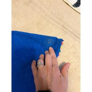 Super fun midi length tee shirt dress. Blue with multi color pom pom detailing at the neckline and sleeve hems. This is a great elevated basic!