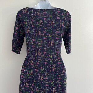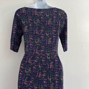 Boden dress, women's knee-length, abstract print dress, gathered waist dress, navy dress, multicolor dress, half sleeve dress, pullover dress, casual dress, semi-formal dress, polyester dress, lightweight fabric dress, Boden women's clothing