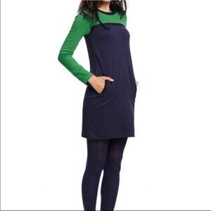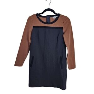 Boden Colorblock Ponte Knit Charcoal Tan Sheath Dress, Size 2. Pit to pit 17", shoulder to hem 32", Scoop Neck, Exposed Zip Closure, Pockets, Stretch. Good Pre-Owned Condition