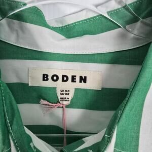 This Boden cotton midi shirt dress combines crisp stripes with effortless style. The vertical green and white pattern creates a flattering, elongating effect, while the waist tie adds shape when desired. A versatile dress that works perfectly for office wear, weekend outings, or casual occasions year-round.