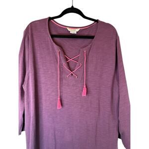 Boden women’s size 18 tunic dress in a rich warm purple shade with soft pink lace-up neckline and tassel tie detail. Made from 100% cotton, this comfortable, breathable dress features 3/4 sleeves,and a relaxed, slightly stretchy fit that flatters without clinging. The soft jersey fabric and effortless silhouette make it perfect for casual wear, weekend outings, or travel-ready style.