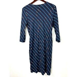 This beautiful Boden Cressida Faux Wrap Dress in size 6R is perfect for any occasion. The dress features a V-neckline and classic fit 3/4 sleeves, with an elastic waist for added comfort. The wrap dress style is accented with faux wrap detailing and a geometric/dot pattern in blue, making it a colorful and sophisticated addition to any wardrobe. The dress is made from a knit fabric blend of cotton and modal, and is machine washable for easy care. It has pockets for convenience, and is suitable for summer, fall, and spring seasons. Whether you're traveling, attending a party, or just dressing casually, this dress is a must-have.